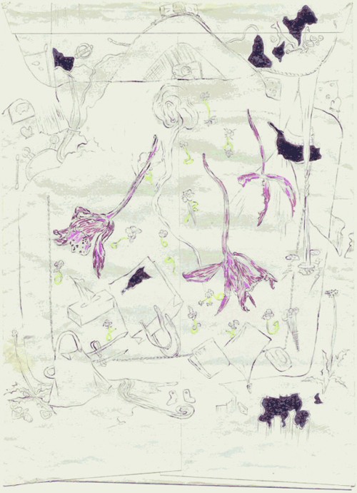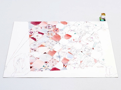 Pencil, colored pencil and watercolor on paper