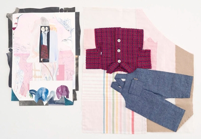 Suite of 2 elements in watercolor, mixed-media on paper and fabric patchwork