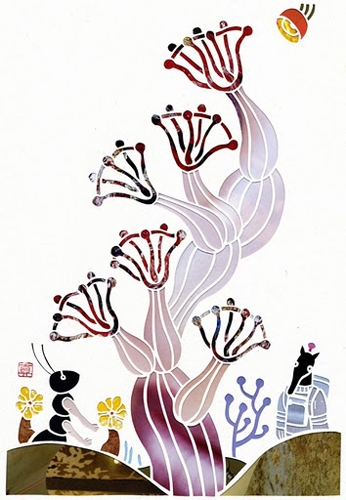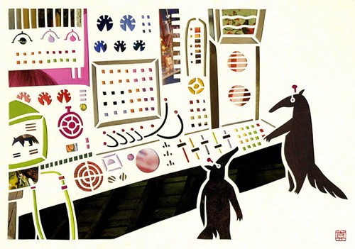 Japanese paper cut out with collage of magazines and advertisements on back