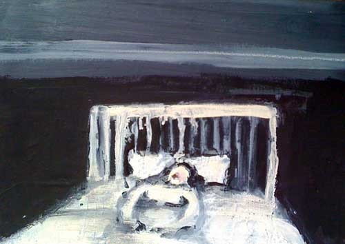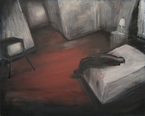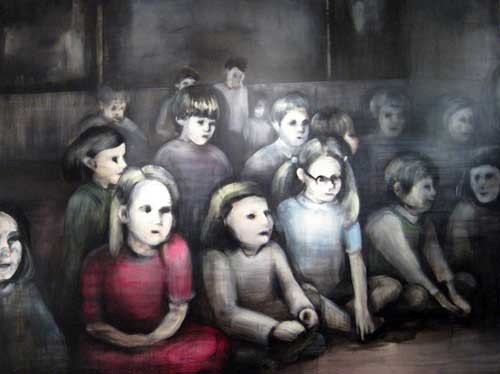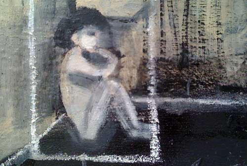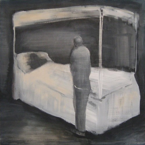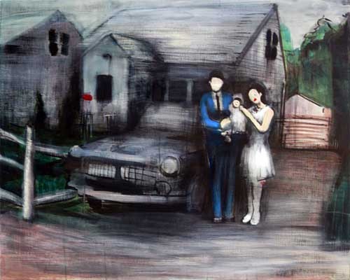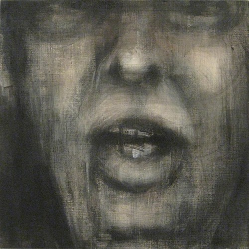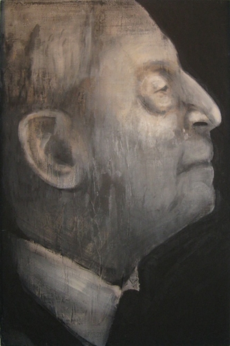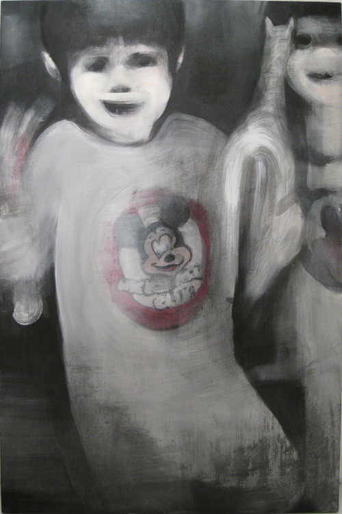 Acrylic, charcoal and water-thinned paint on canvas mounted on panel