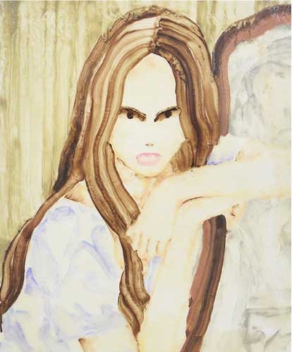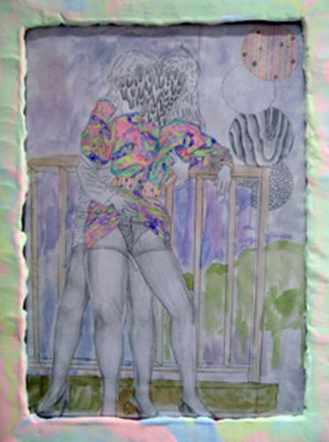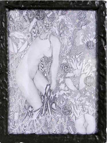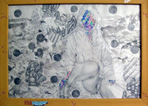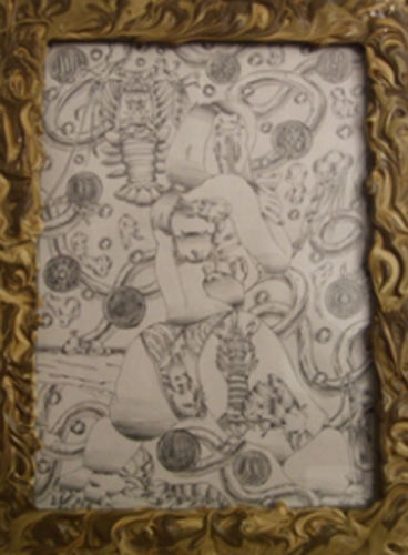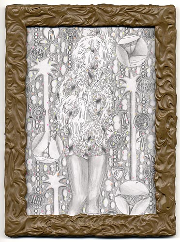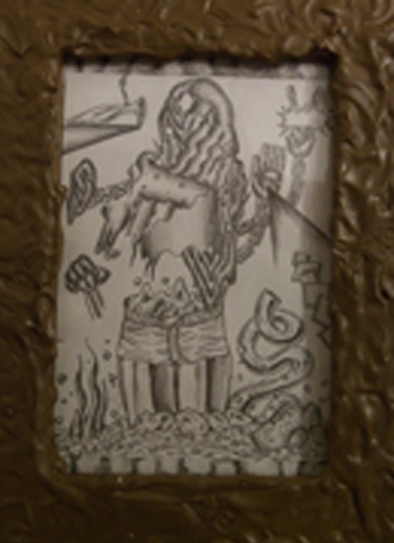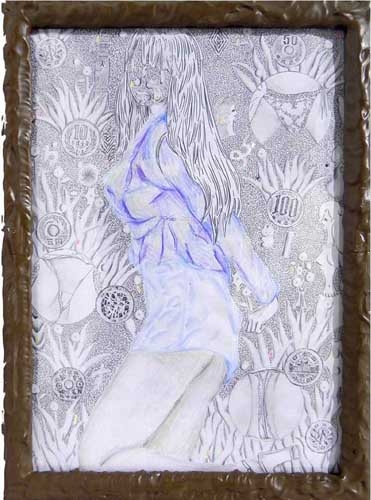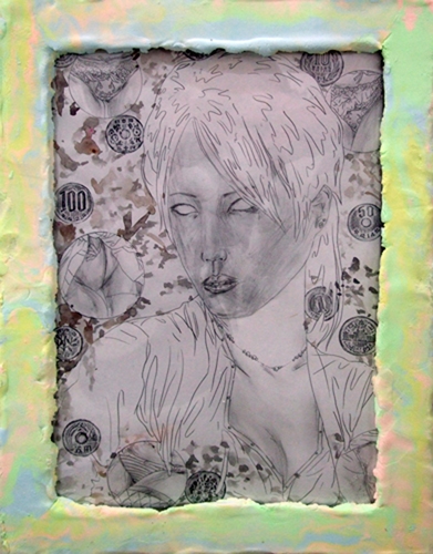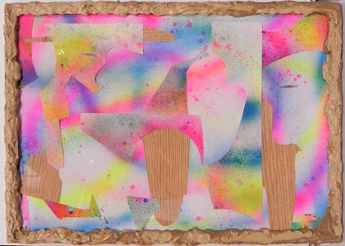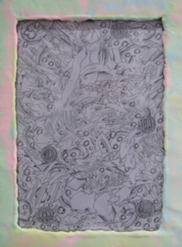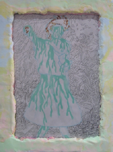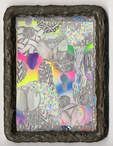 Pencil, watercolor, spray paint on paper and paper clay on frame