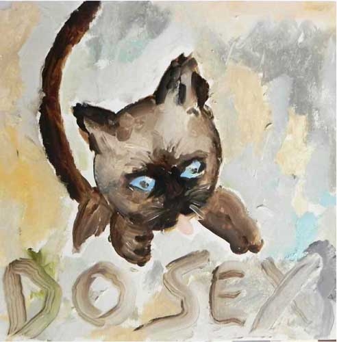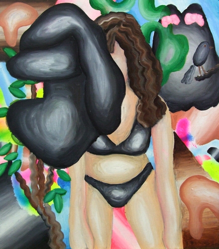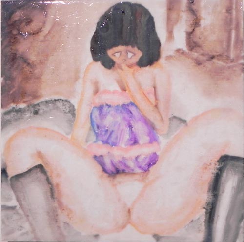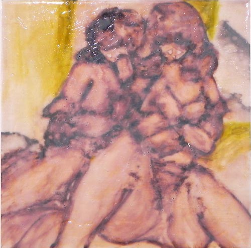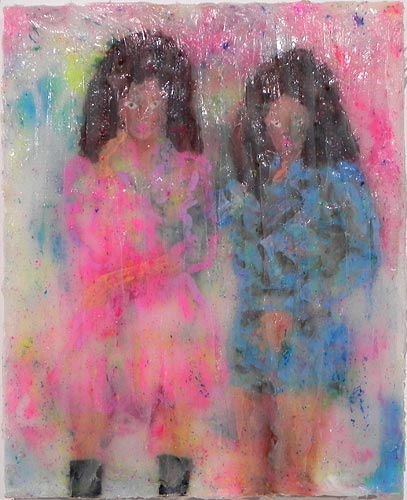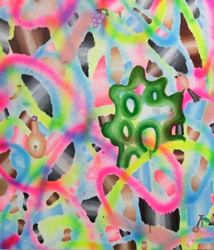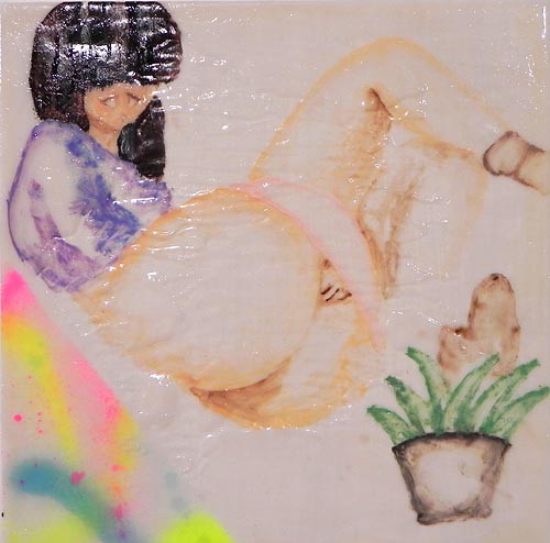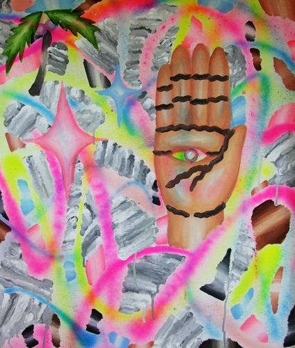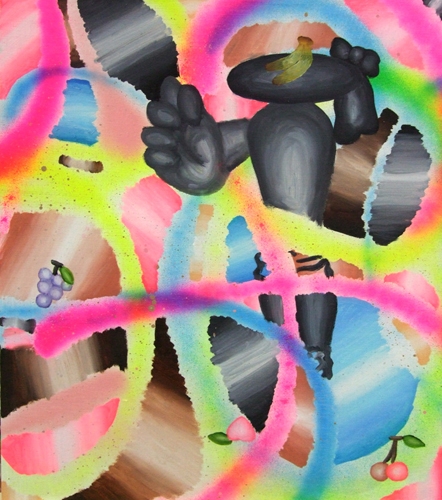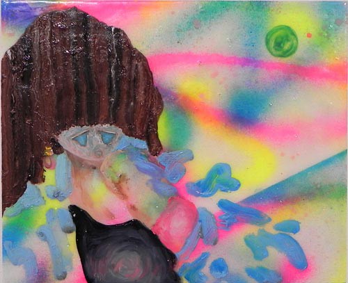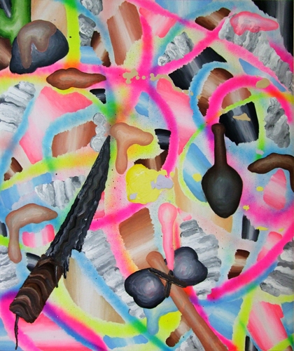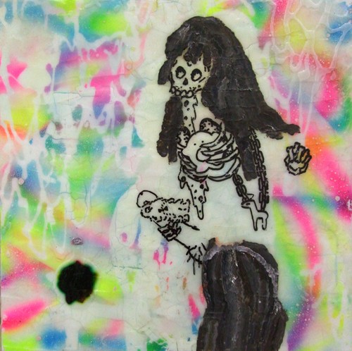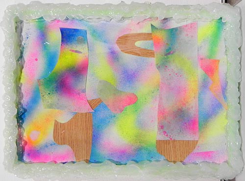 Glass paint, dimensional fabric, spray paint and silicone on board