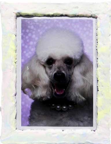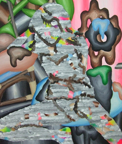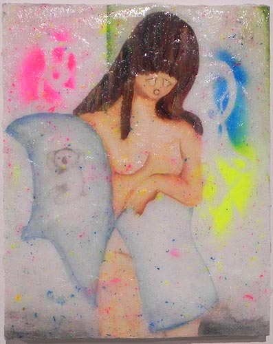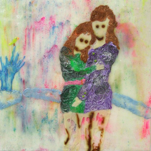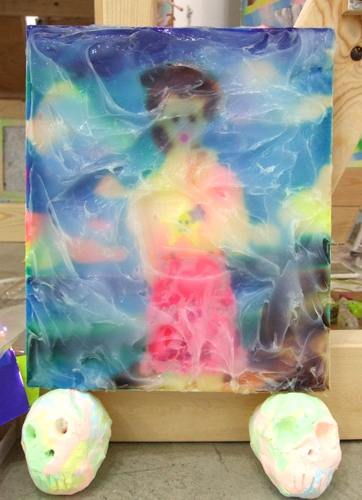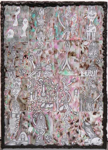 Glass paint, dimensional fabric, spray paint and silicone on board with paper clay