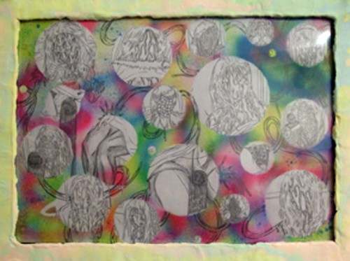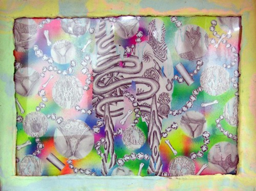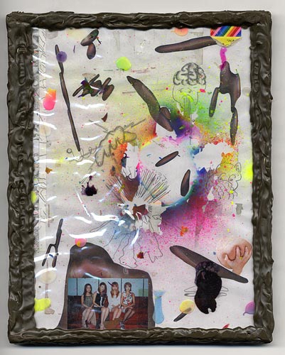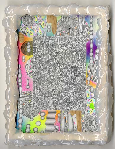 Collage, ink, pencil and spray paint on paper with silicone on frame