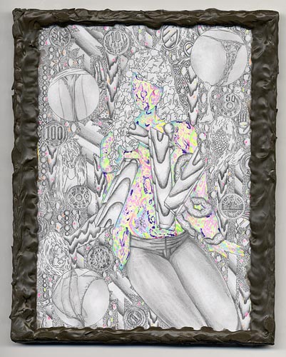Pencil, felt-tip pen, colored pencil on paper and silicone on frame